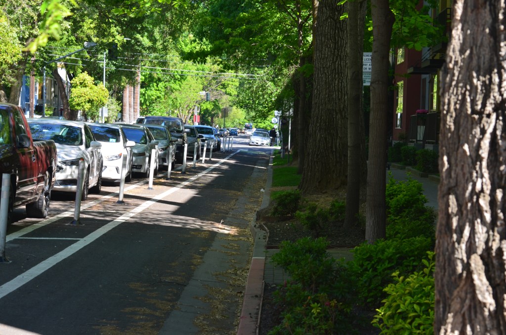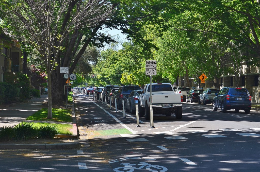 So, this one city street has been narrowed for cars while allowing cyclists to speed through a congested area safely with parked cars serving as barrier. Los Angeles, San Francisco and Oakland are other California cities that have set up these special bike lanes.