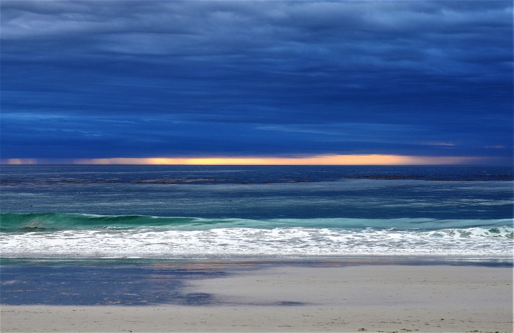 The colors along Carmel-by-the-Sea beach are ever changing. I prefer the days when the surf has a green cast to it. Tourists are disappointed to see a day like this–the cloud cover destroys the postcard sunset–but the array of colors in this shot make it one of my favorites.