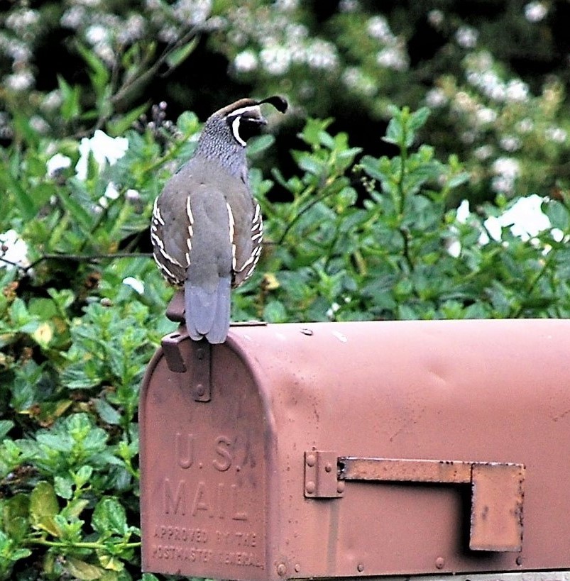 This male quail has a purpose for being on the mail box–the rest of his family is below in the lavender. Photo taken two days ago.