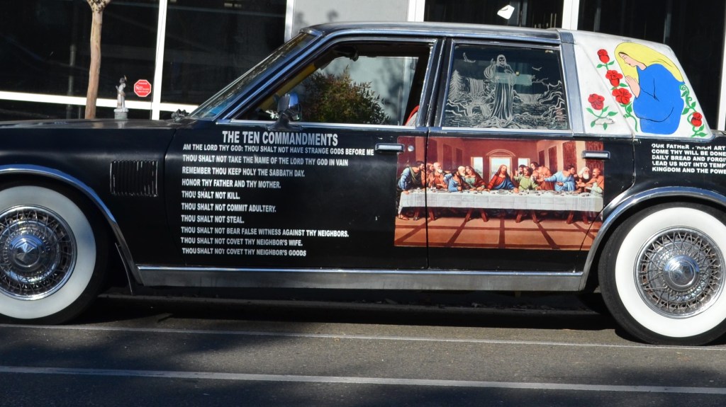 The side of the car had the Lord’s Prayer and The Ten Commandments in white lettering with a rendering of da Vinci’s Last Supper between them.