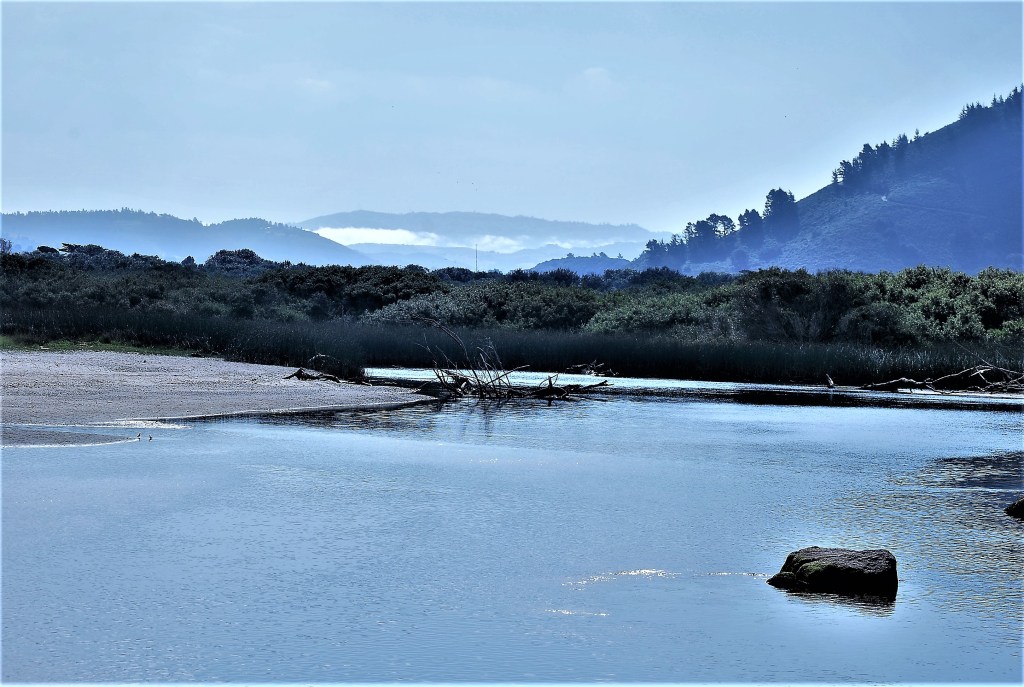 It’s been a wet week in the Carmel area. Here are two views from the same spot on Carmel River State Beach: (top) looking up river–those are low flying clouds in the distance; (below) and after a 180–the river flow into the ocean with Point Lobos on the horizon. Peace.