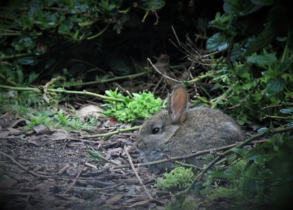 This photo taken yesterday captures the patience of a rabbit that has been living in our front yard for nearly a year. It simply sits about two feet from a stump and waits for the small amount of Kenilworth ivy that I will place on it twice per day. We have an understanding.
