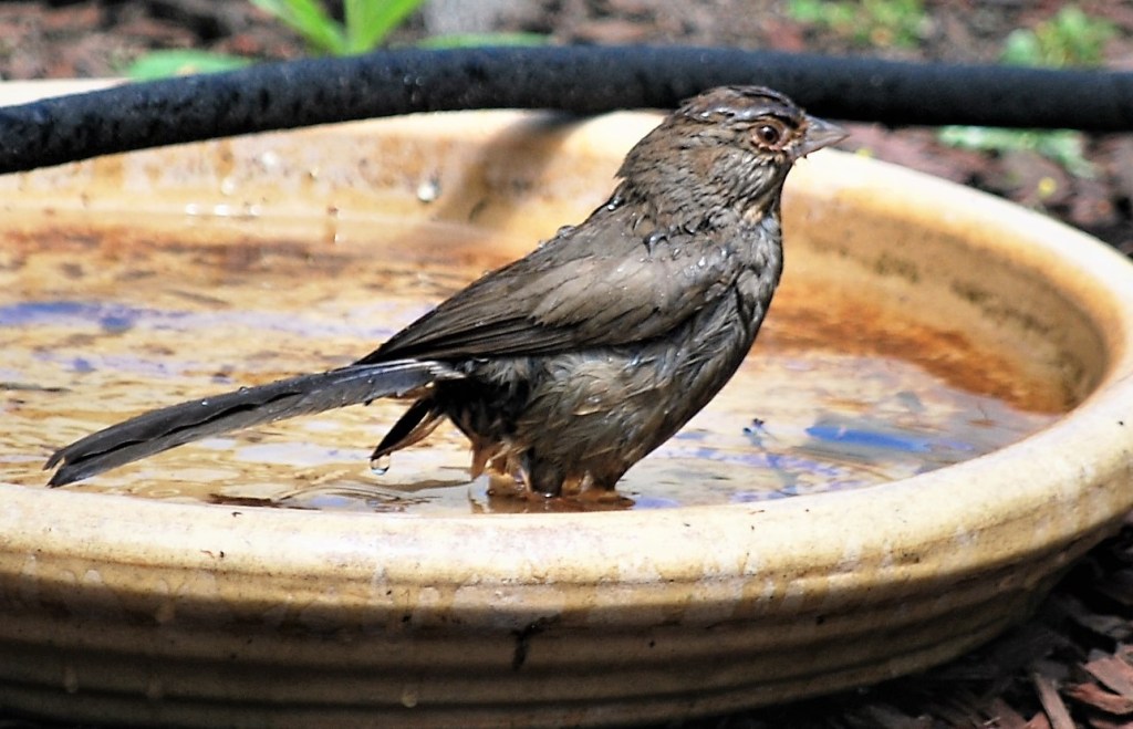 I took a few minutes yesterday to watch a California Towhee take a bath in our front yard. Actually there were two towhees vying for the bath, or maybe it was some kind of mating ritual. They each would fly straight up about a foot apart, stop around four feet from the ground and return to the ground and then repeat the routine. I ran to get a camera. When I came back there was only one bird, as shown above.