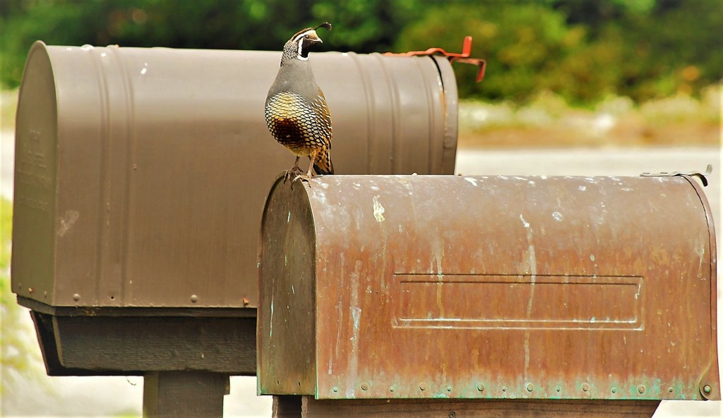 Our morning alarm clock, a male California Valley quail, shrieks from the top of our mail box. This is amusing, save for the fact that the shrieking starts at sunrise. Photo taken yesterday, early morning.