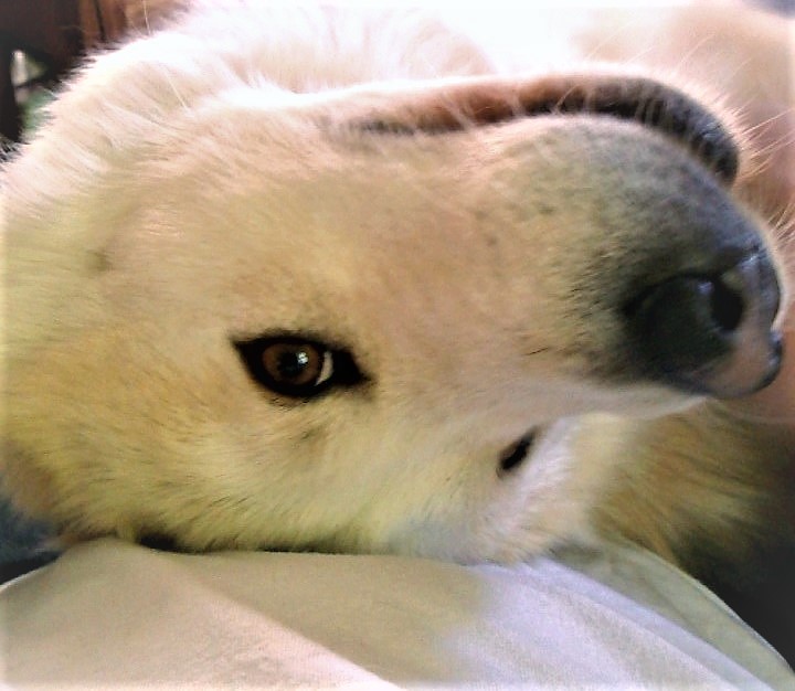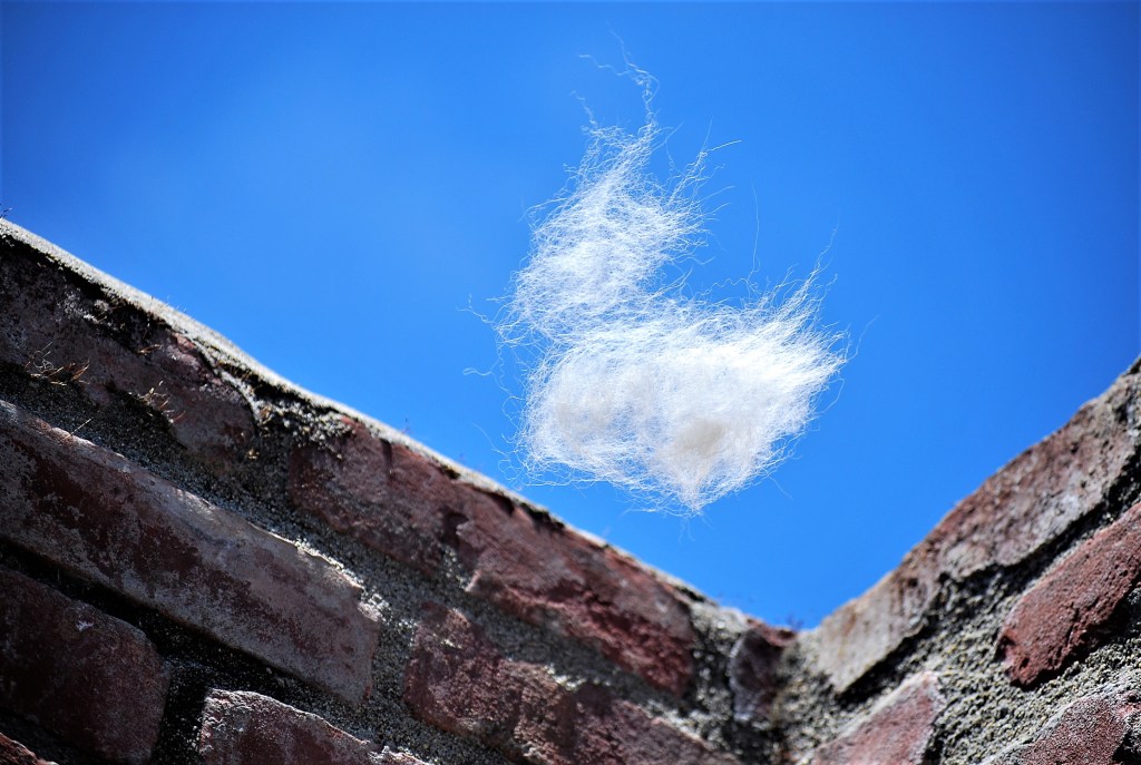 Yesterday was windy, so much so that Teddy’s fur became airborne after I brushed her. Like a hovering UFO, a ball of white fur circled upwards before disappearing over an eight-foot high, brick wall. I got the camera and began brushing her again to get this shot. You should see the inside of the house.