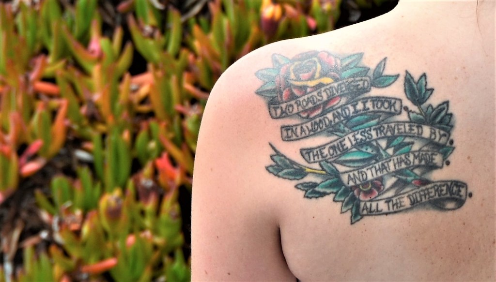 The last three lines of Robert Frost’s “The Road Not Taken” appear as a tattoo on a woman’s left shoulder as she stands at the beach facing away from the Pacific Ocean. This iconic poem, published in 1916 during WWI, has been analyzed a thousand times over. I say it is simply about making a choice.
