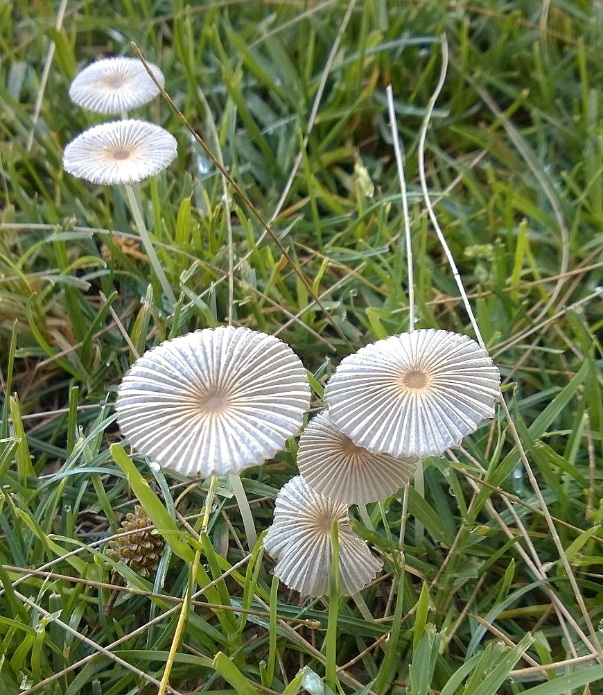 We were walking the dogs by a golf course yesterday when we spotted mushrooms that looked like tiny umbrellas. Anne took these shots with her cell phone while holding two dogs on leash. (I had a german shepherd.) I guessed they might be parasol mushrooms. But, that naming would have been too easy. Most internet images claim these are Japanese umbrella mushrooms. I’ve never seen this type fungi before.