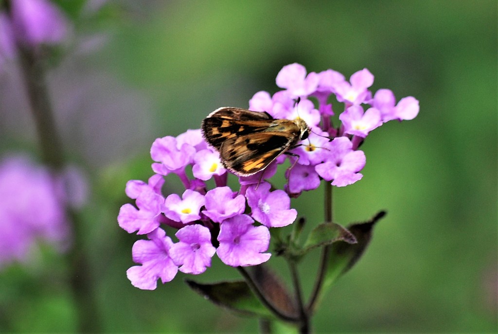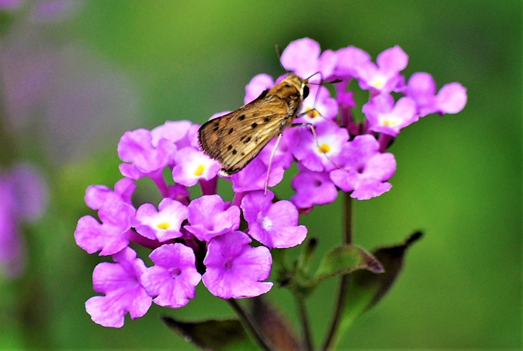 Butterflies have been far and few between this year. Yesterday, our backyard was visited by two fiery skipper butterflies. They are about an inch long and often hard to spot because of their small size. However, a fiery skipper appeared to be stepping on brightly colored flower petals–that made for a nice shot.