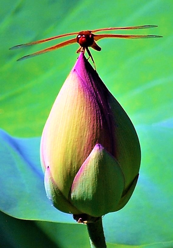 A red dragonfly and a water lily with filtered sun provide colors and shapes that go beyond my limited imagination. Photo taken at William Land Park’s lily pond, Sacramento.