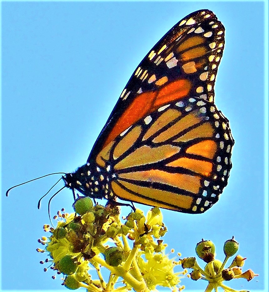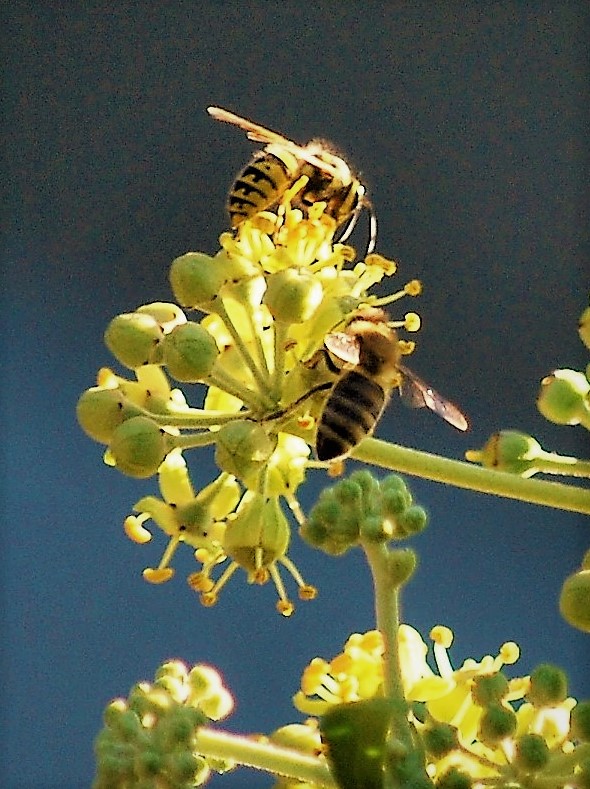 The ivy in our backyard, which blooms in September, was packed with bees and hoverflies yesterday. Took this shot to show how the hoverfly(upper left) and an Italian honey bee (lower right) work almost side by side to collect nectar. In past years I’ve seen butterflies, especially monarchs, right next to bees in this ivy, but this year nothing like that yet…