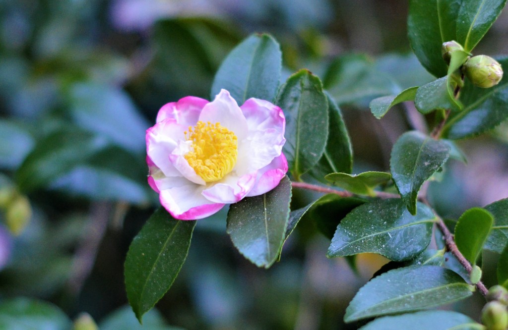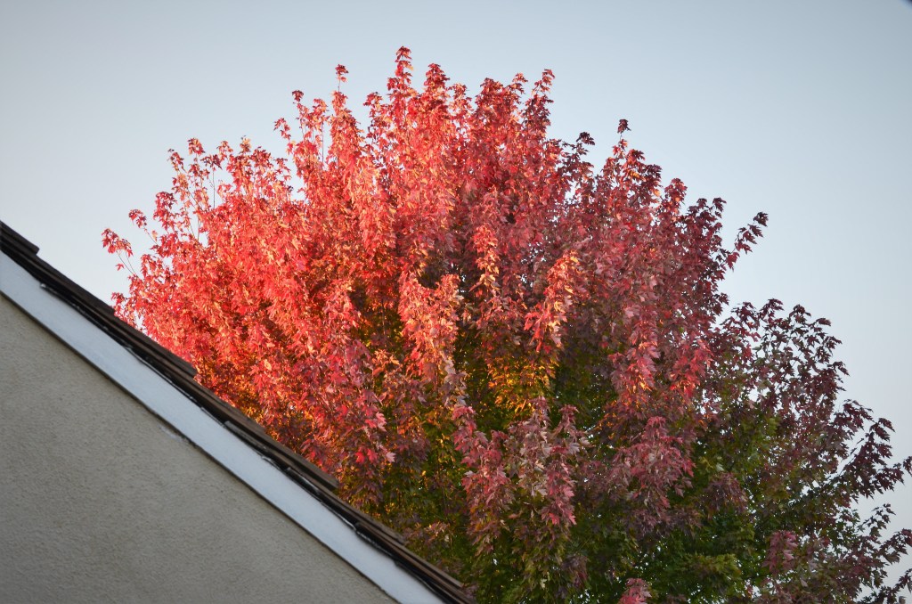 The sun was on the horizon, the day almost done when I went outside to notice what I hadn’t. The camellia in the front yard is variegated–I thought it was white, but the blooms are white and pink. The neighbor’s tree is turning red. And the light in the bedroom has a warm glow–I should be reading by it. I am thankful to be able to notice these small things.