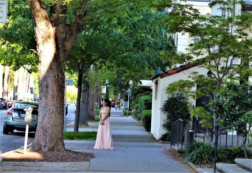 In a prom dress,