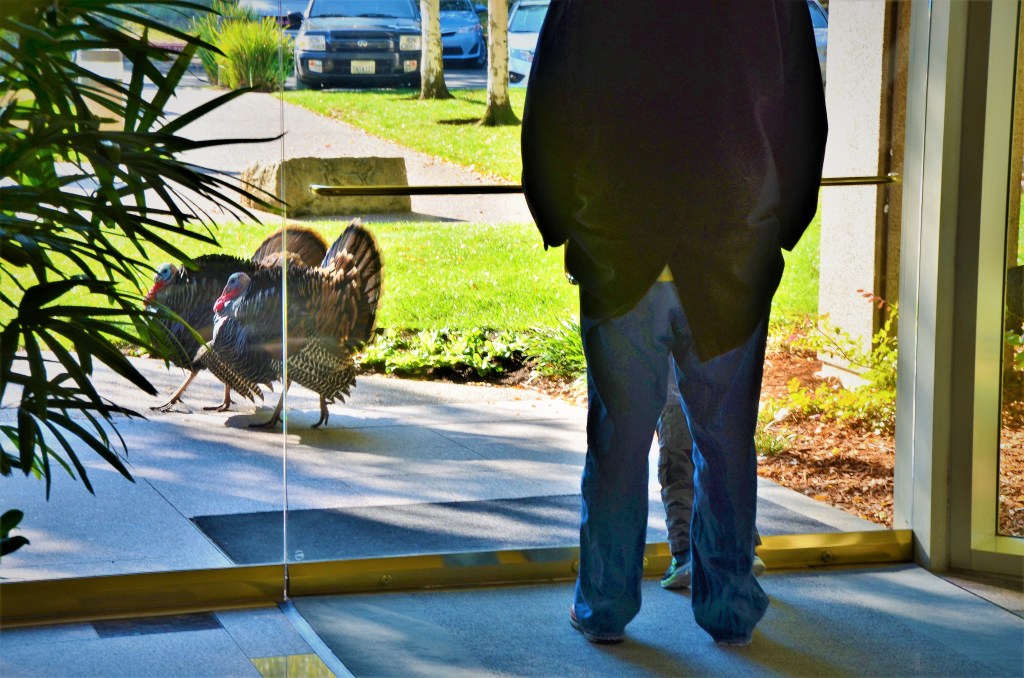 Here’s one of my favorite shots of wild turkeys in Sacramento. I took this inside an office building near the Sacramento River. The turkeys were in no hurry to get to work.