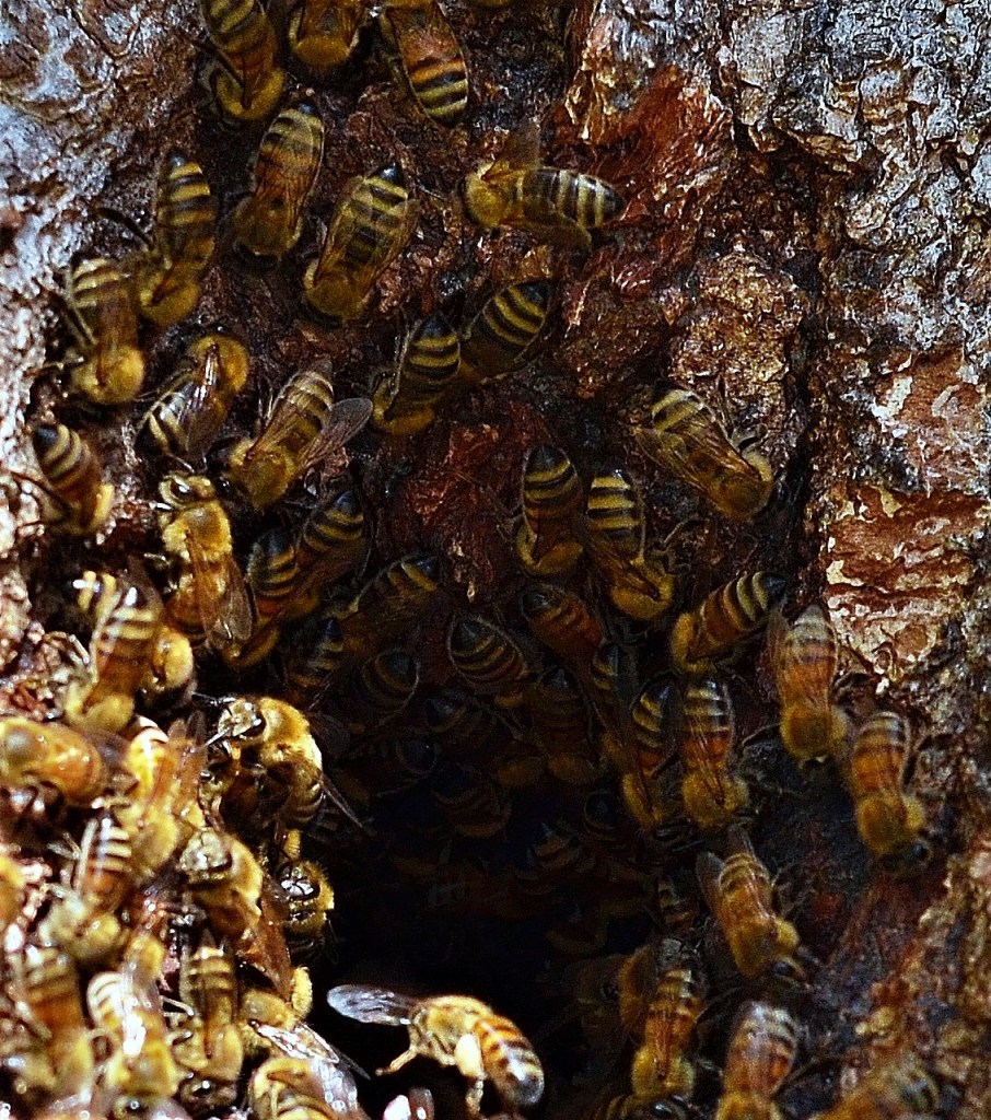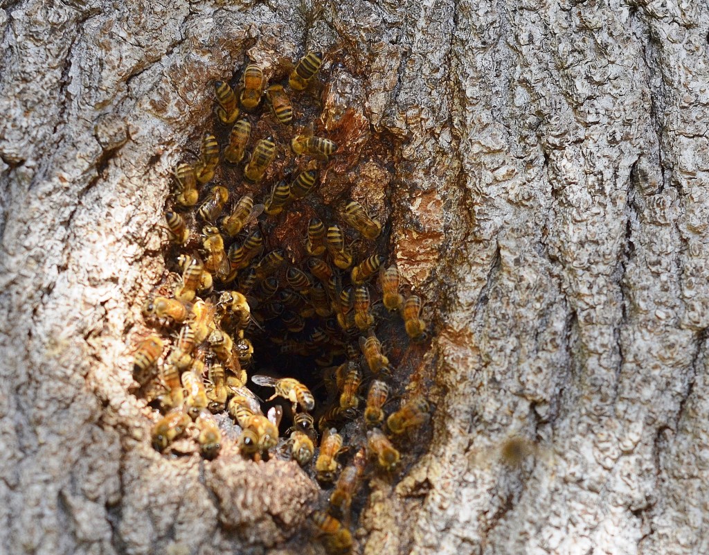 Yesterday I spotted a swarm of honey bees flying in and our of hole in a liquid amber tree, most fittingly, since honey is sometimes called “liquid amber.” A knock on the door led to a brief conversation with the owner who said the bees have been in the tree for a few years. We gave the bees a thumbs up!