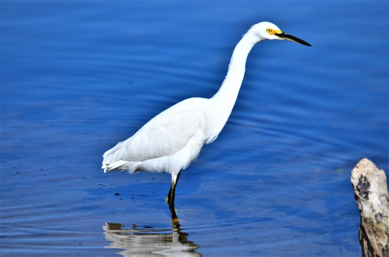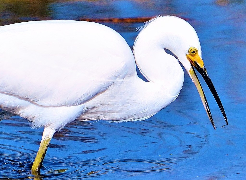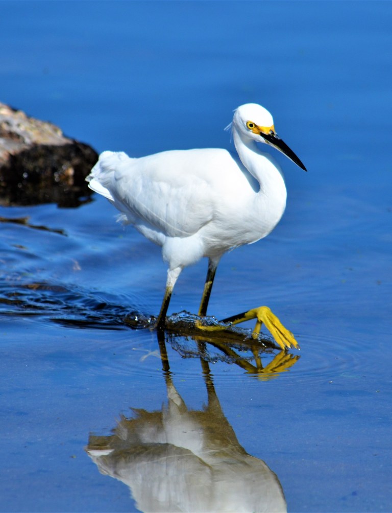 I went for a walk to the Carmel River State Beach yesterday, camera by my side. Hoped to find some pelicans, but the river beach was taken over by Canadian geese. Headed for the lagoon to get a closer look at some loons when an egret flew over my head and landed about six feet away. I started taking photos–the egret didn’t seem to mind, save for one irritated look it gave me. Honestly thought the bird was posing much of the time as it stalked some river prey. Eventually, it flew away.