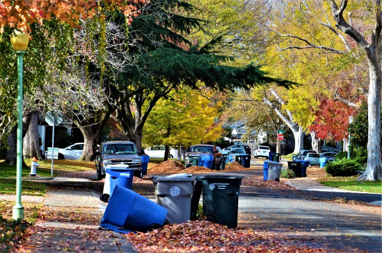 Despite rain and wind yesterday, Sacramento’s trees did not want to lose their colorful leaves.Leaf piles and garbage cans have turned Sacramento streets into obstacle courses.The leaves on this roof were rained on, so now they are sticking to the tile.