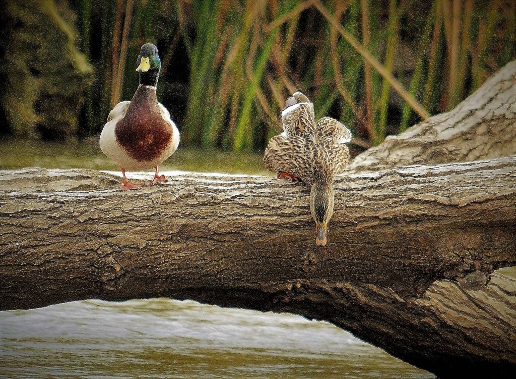 On a misty day in March, 2019 I watched two mallards standing on a fallen tree in the rain-swollen Carmel River. I took this photo and wrote a poem about the moment.