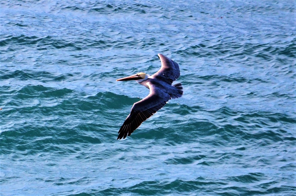 Okay, Day Three and no shots of people yet, just my old standby, the brown pelican. Most of my pelican captures have them flying over me, sometimes by me but rarely, like this one, gliding below me. Took this shot with a 300 mm lens while standing on a cliff looking down on the Pacific Ocean.