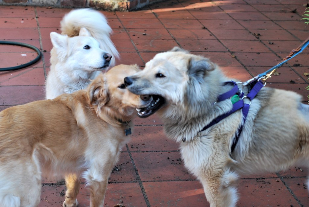 We are fostering a chusky (chow husky mix) who has had a rough start in life from no home to health problems requiring surgery. Ivan is close to two, very much in the puppy stage. He likes to play and Molly is his mentor. In the photo she is teaching Ivan to be gentle–that’s her head that Ivan has in his mouth. Trust required.