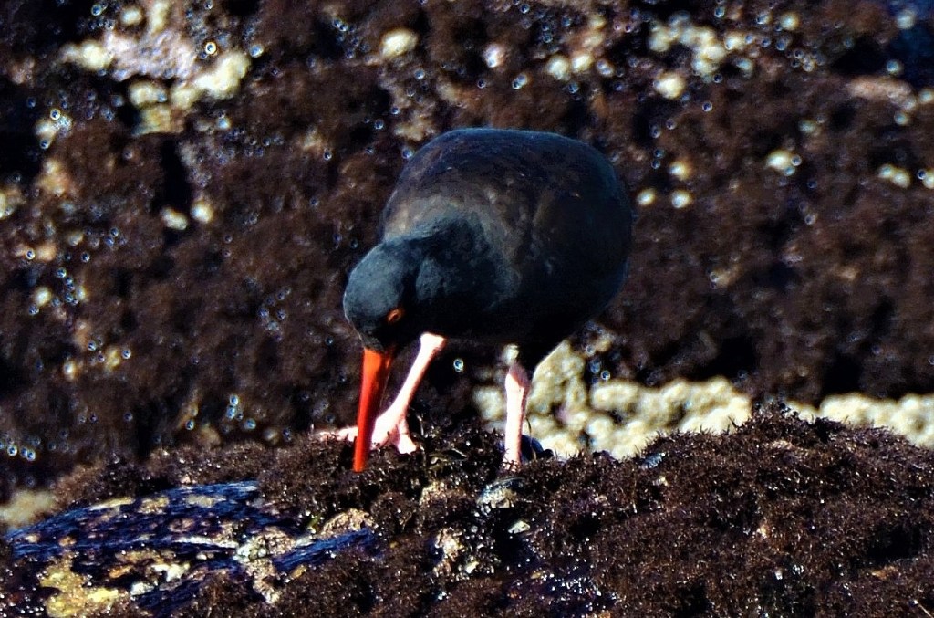 Just like it reads in the bird guide books, the black oystercatcher is found on the rock coastline of the Pacific Ocean. As the coastline disappears because of rising sea levels, development and erosion, the oystercatcher is displaced. Yesterday, I spotted a pair on the rocks at Asilomar, three miles north of Carmel. This was my first sighting of the oystercatcher in two years. At first I didn’t see them–they are the same color as the rocks they walk on in search of shellfish at low tide. But, when they look up, their cover is blown by a bright orange bill and eyes. There is an organized effort to track these birds as their population decrease is viewed as a sign of the harm caused by global warming