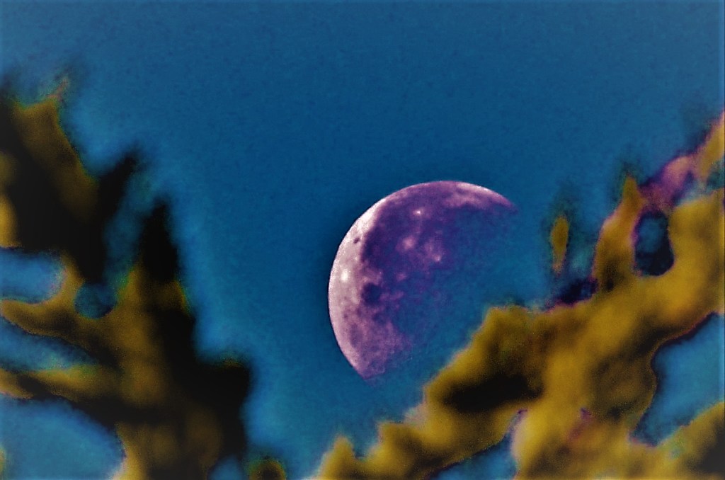 Here he is, the man in the moon. The yellowish blur in the foreground are cypress tree branches, here on Earth.