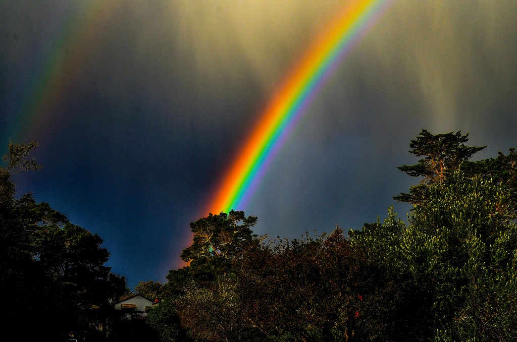 Took this shot a year ago of a series of rainbows over Carmel. There was a 60-second period when the sun burst through a storm cloud to produce the brightest rainbow colors I have ever photographed. I remember walking in the rain, camera under my jacket, when the skies cleared briefly and a steady rain stopped as if it were turned off by a switch. Peace.