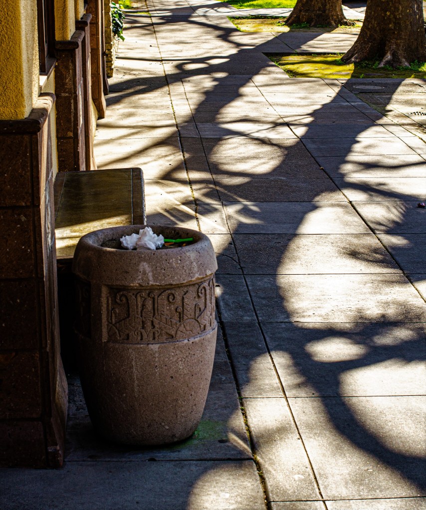 Many of Sacramento’s downtown streets are lined with trees. In summer the trees provide cover from the sun, but with a low midafternoon winter sun, the bare branches and trunks project shadows on the sidewalk. I assume some may say, “so what?” Well, I prefer walking on concrete sidewalks that are crisscrossed with shadows rather than on ones that are solid gray. Took this shot yesterday. That’s it, just shadows on a sidewalk.