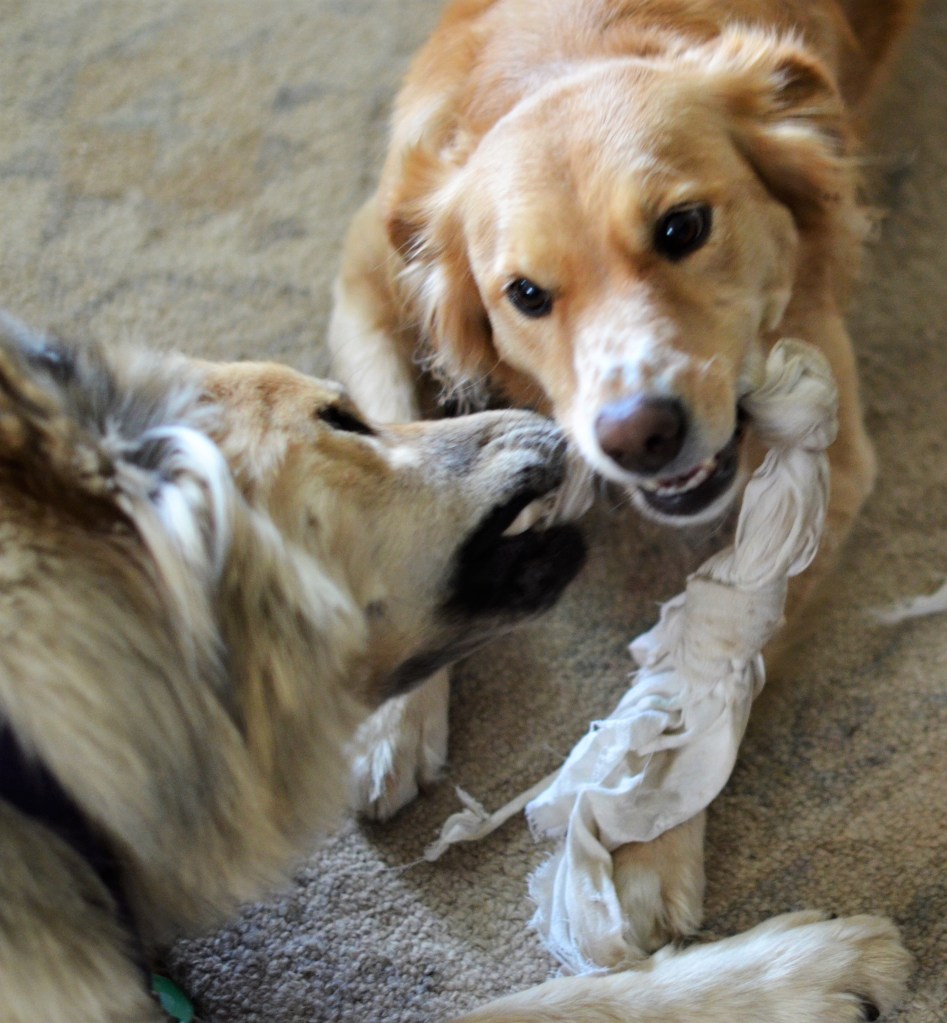 Although Molly is smaller than Ivan who has sharper teeth, she dominates their “tug of war” with socks, a daily event on our living room floor. It is my observation that Ivan doesn’t win on purpose. Their tug is usually a sustained tie until Molly decides enough is enough as she shakes her head to end the tug…and Ivan is okay with that. Molly, six, is a mentor to Ivan who is a big puppy at about 18 months. He follows her signals, in most cases, especially the one that says play time is over.
