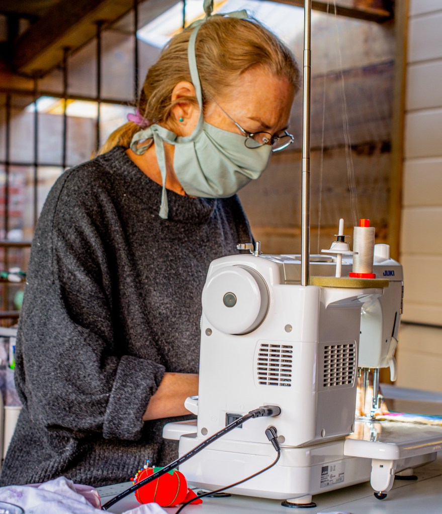 Anne is sewing masks for the war on Covid-19. We practice social distancing, wash hands constantly and wear masks, in part, to remind others of the importance of social distancing.
