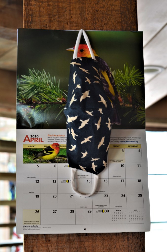 We keep a calendar in the kitchen. I noticed this morning that April is “blank” and my mask, very tellingly, is the center of attention.