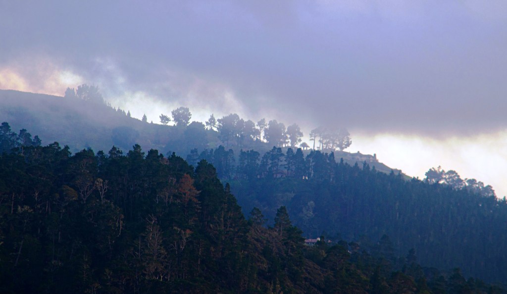 Here’s the view from our house of the fog crawling up the ridge line at sunset yesterday. Tough to photograph, but nice to look at. Waiting for a clear night–the wait may be long as inland temps are 30-degrees higher than along the coast. Surf’s up– that’s the weather report for the week.