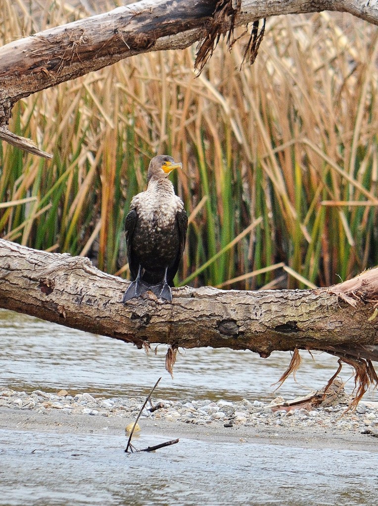 The double-crested cormorant lacks sufficient preen oil to shed water, so it often stands in the sun to dry off. Yet, this condition makes the bird an excellent hunter when diving underwater.