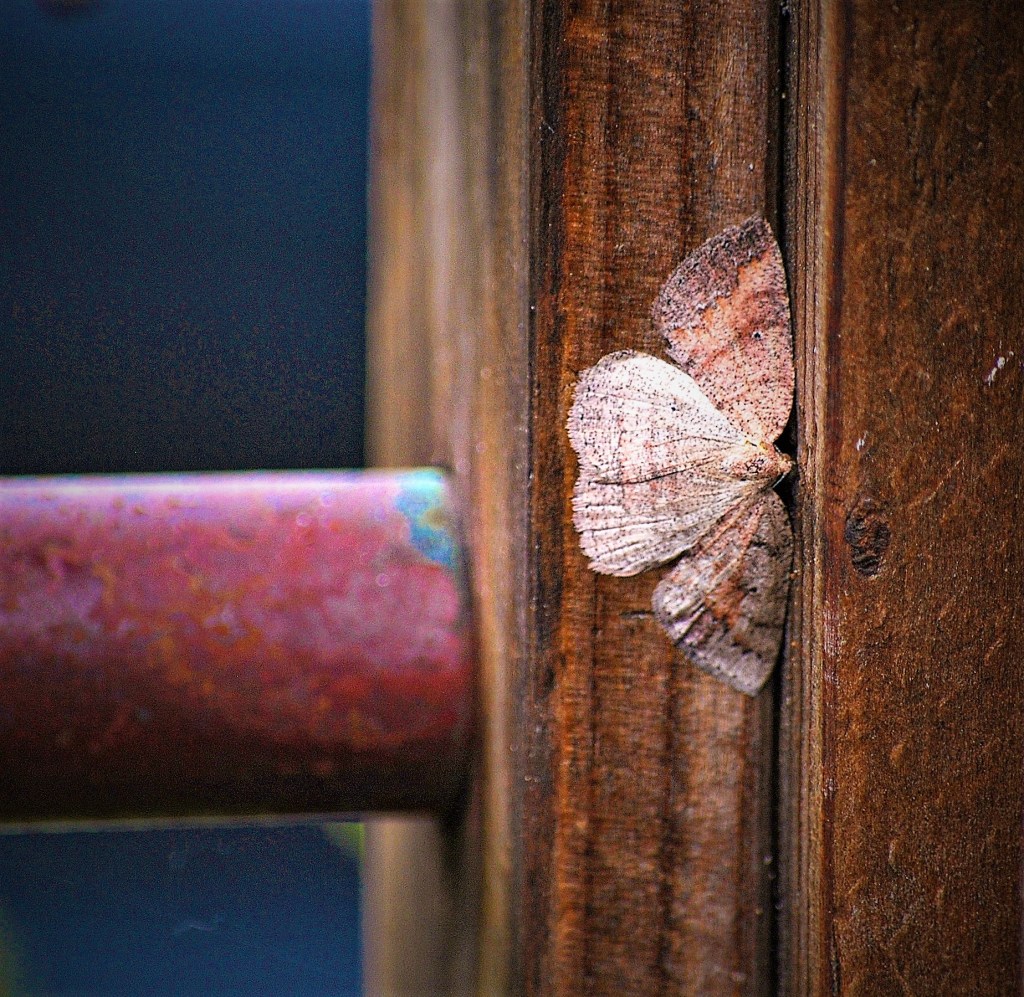 Redwood, copper pipe and a weathered moth create textured art for the moment on our front gate.