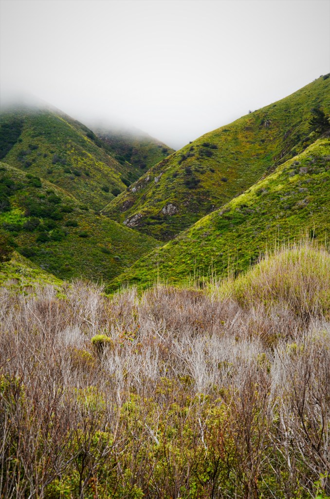 Although it was a sunny day in May, a gentle fog rolled over the tops of hills in Big Sur–the Pacific Ocean is on the other side. Weather has always made this area magical. Consider that I had been hiking-the cooling fog was the next best thing to a shower. Peace.