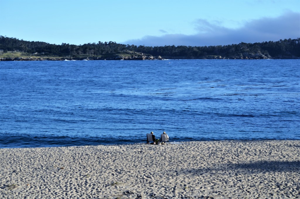 Yesterday, a couple practiced social distancing at Carmel River State Beach while watching calm ocean waters. This sloped beach has a strong undertow that makes it uninviting for families with small children. Also, the parking lot is small. A crooked mile away there were clusters of crowds at Carmel-by-the-Sea beach.