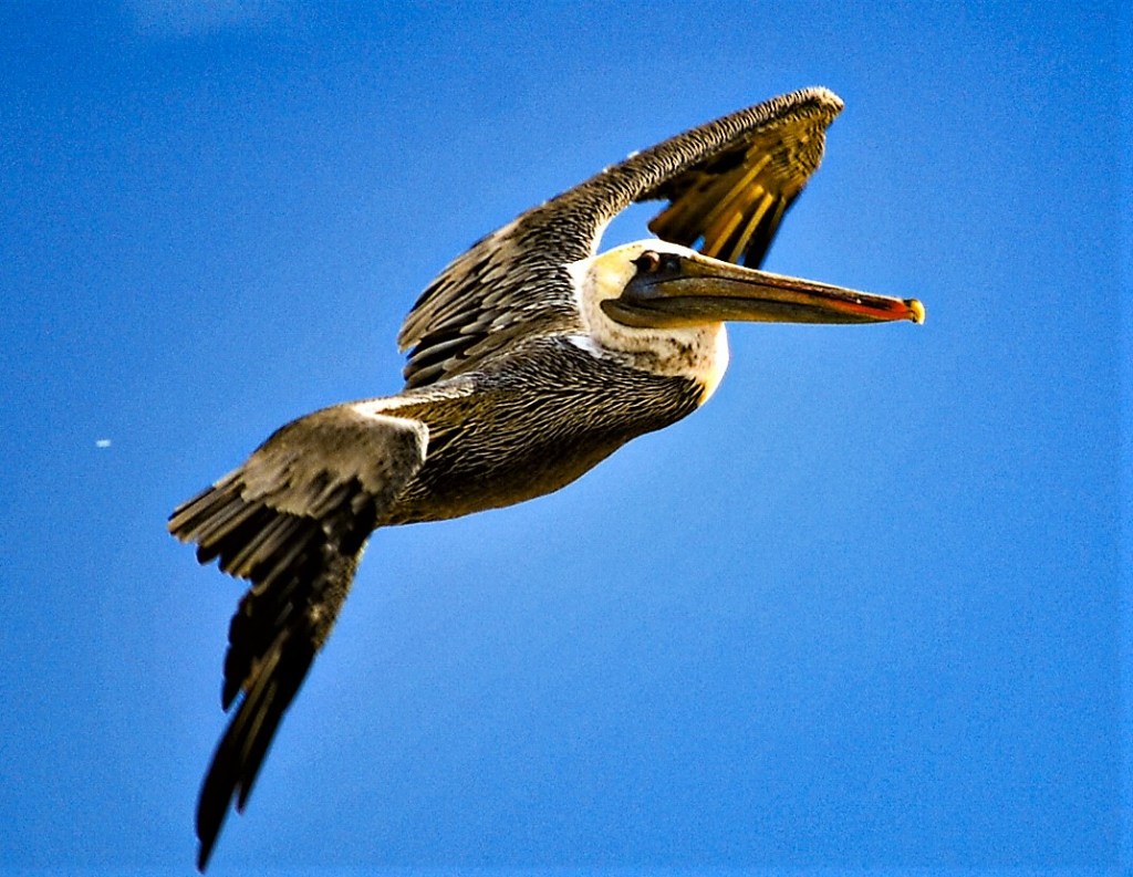 Capturing a well-focused pelican in flight is instinctive challenge for me, so much so, I sometimes overlook the background in the editing process. This oversight is magnified after reviewing the hundreds, if not thousands, of brown pelicans I have photographed over the last few years in Carmel and Monterey. There are just so many close-ups of pelicans–after awhile they begin to look the same. Case in point is this cropped shot of a pelican on a blue sky day. The original frame included a wisp of clouds that emphasized the birds high flight. First, take a well-frame, focused shot; secondly, in editing, consider how background may enhance the main subject.