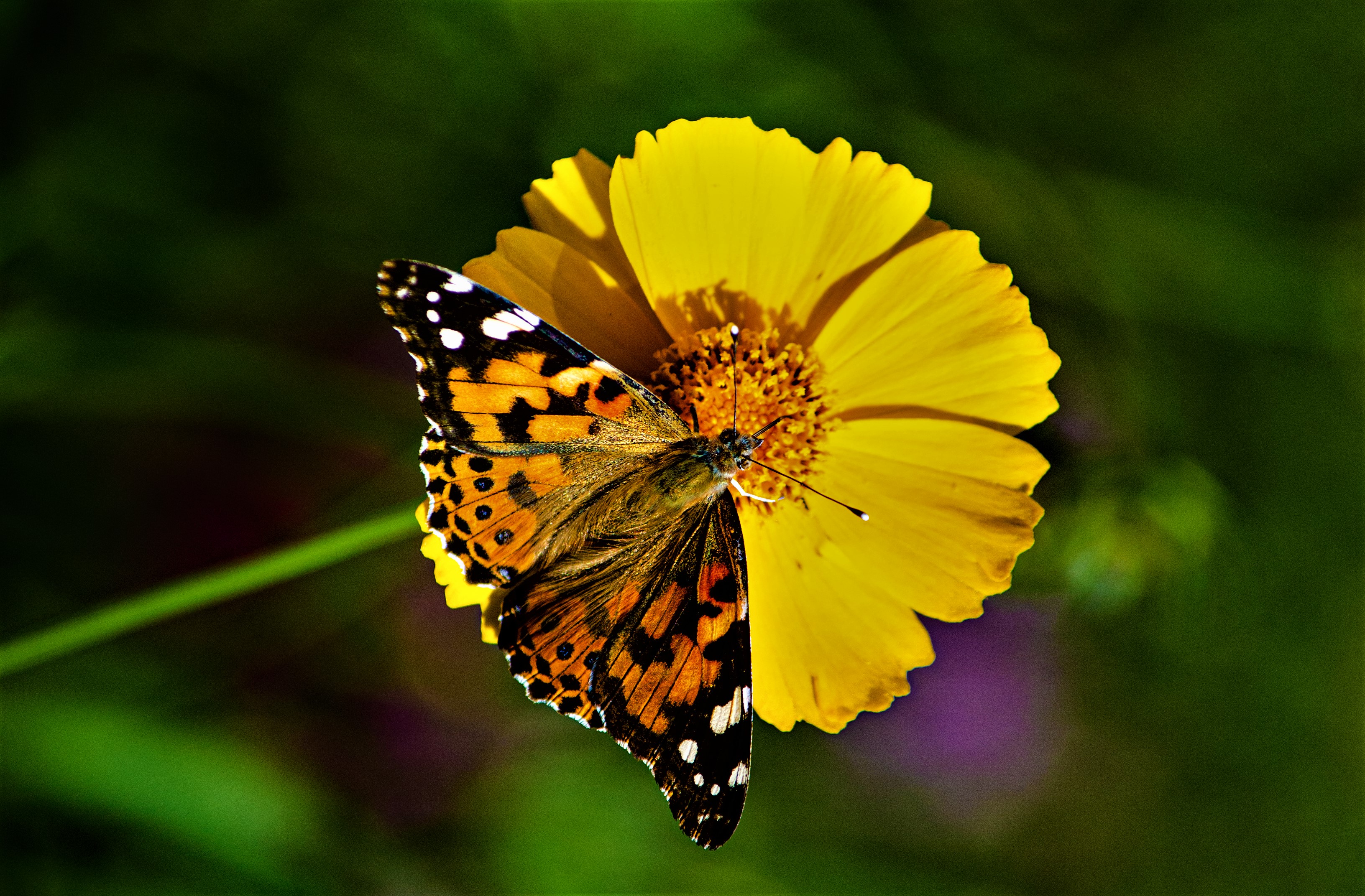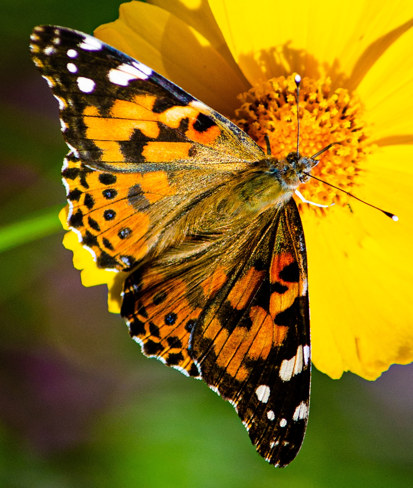 Yesterday morning on the chance that a monarch would return to our backyard, I set up a tripod and camera a few feet from the cosmos flowers. I wanted the sharpest photo possible. I checked the area frequently without seeing a monarch. Finally around 4 p.m. a painted lady arrived. Click.