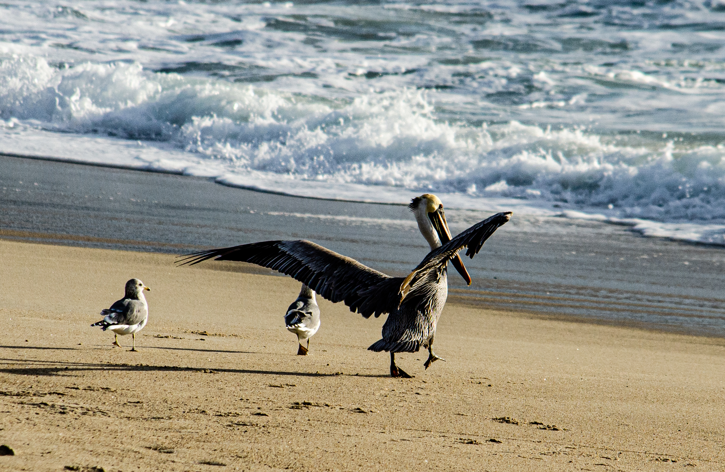 On November 15 and 16 the highest tides of the year are expected along the Monterey Coast. In preparation for this event, brown pelicans and a few sea gulls challenge the rough surf at Carmel River State Beach. The birds wait for the last second to take off before the surf crashes on the deeply sloped sand. This game is not recommend for flightless humans.