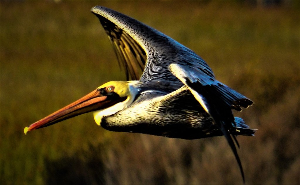 A brown pelican flies over the Carmel River Lagoon and into the sun yesterday with a beady blue eye. Note how the end of its bill is yellow.