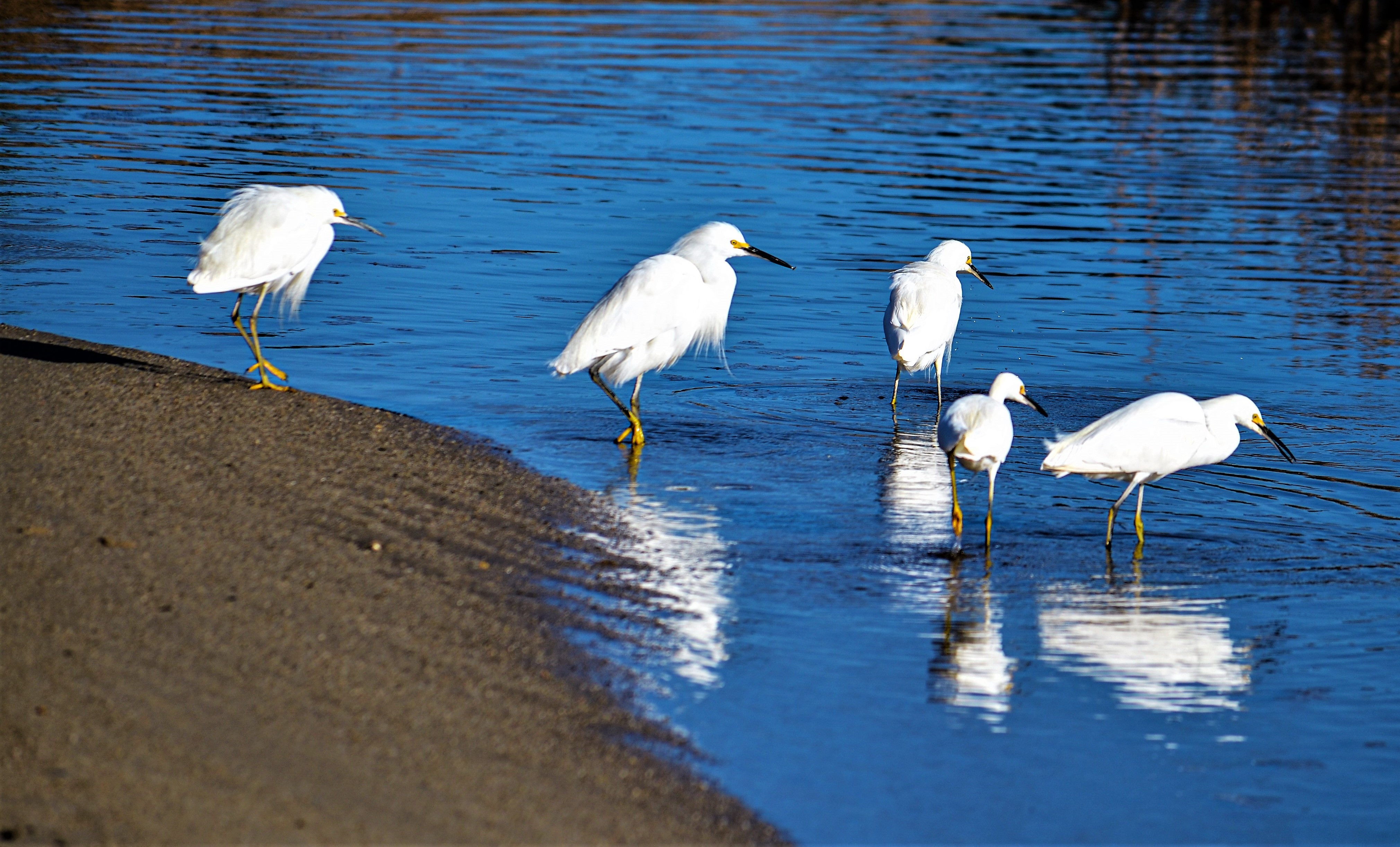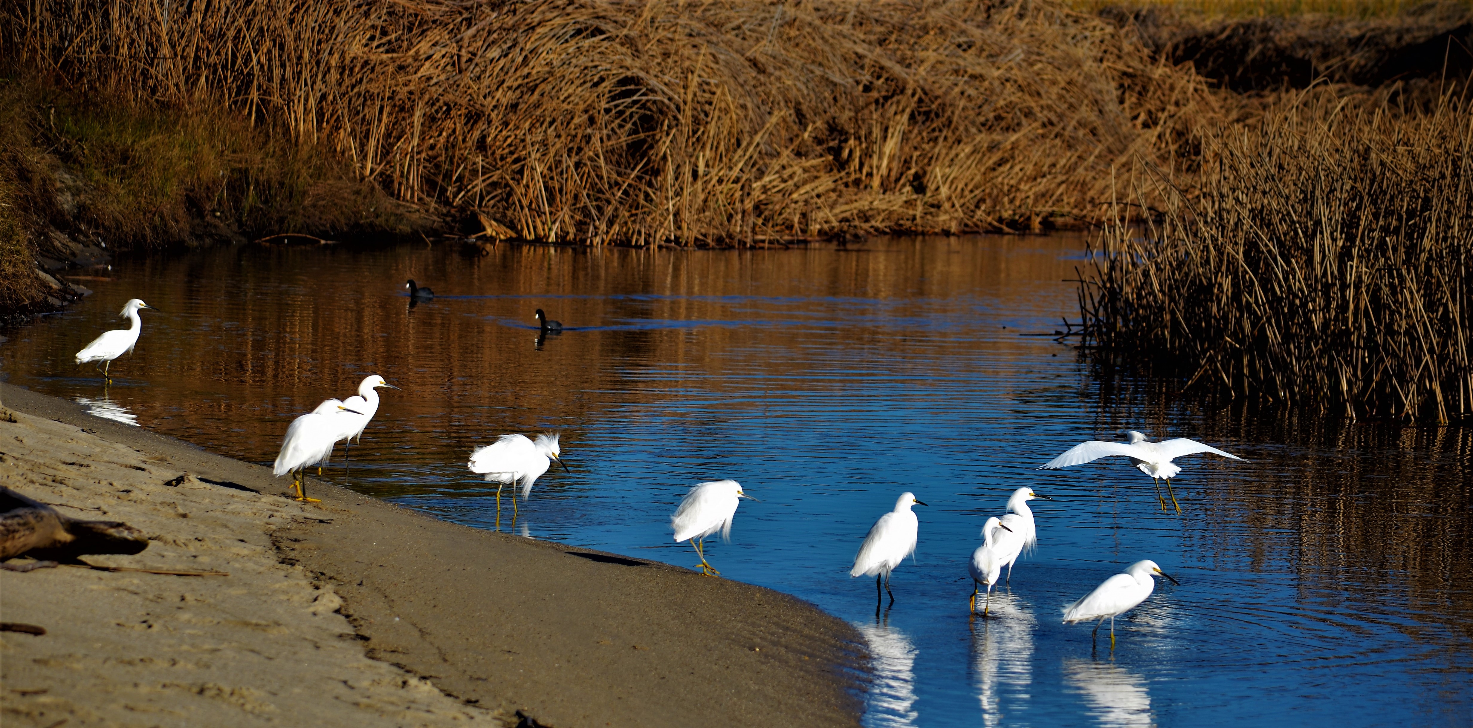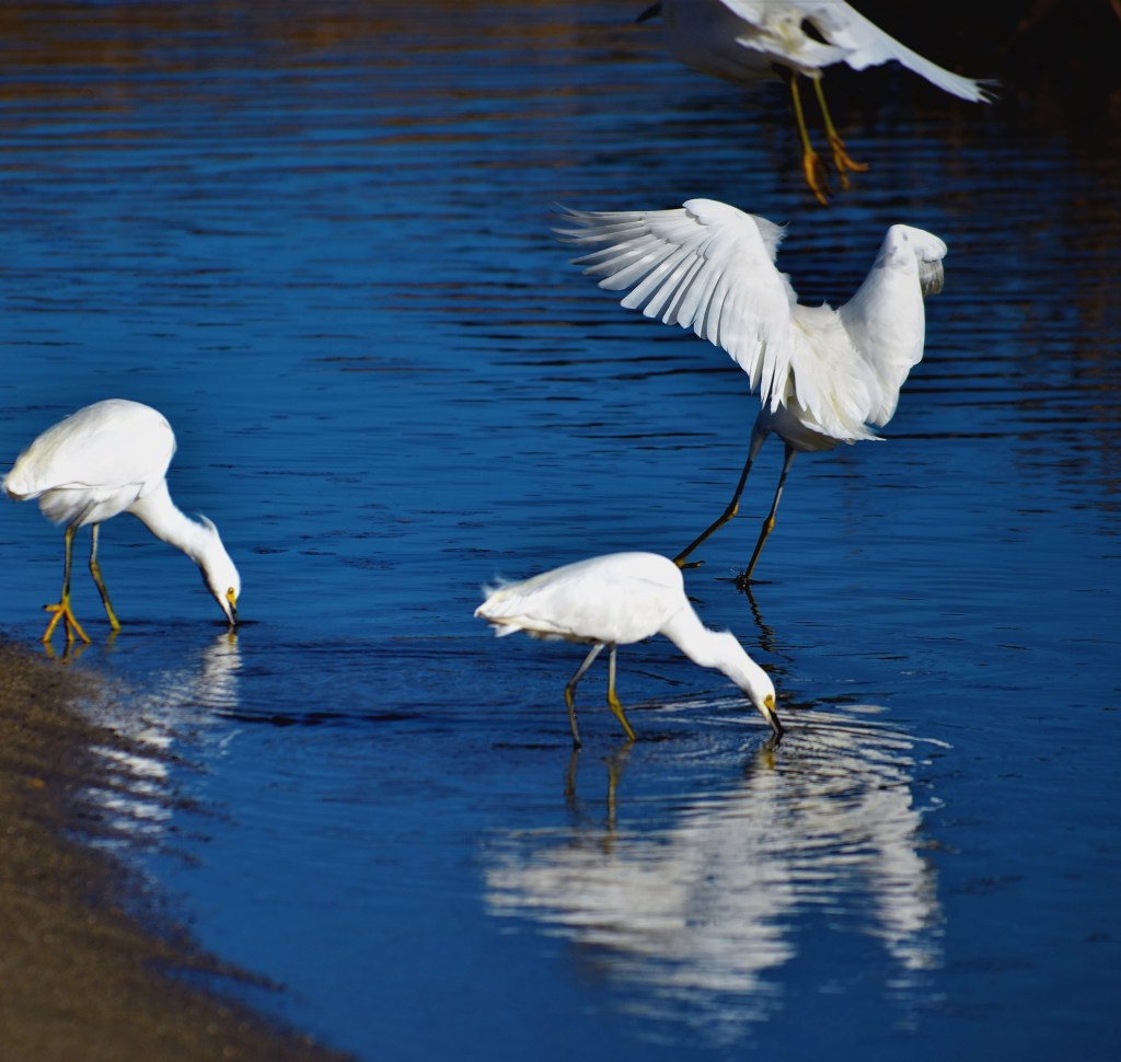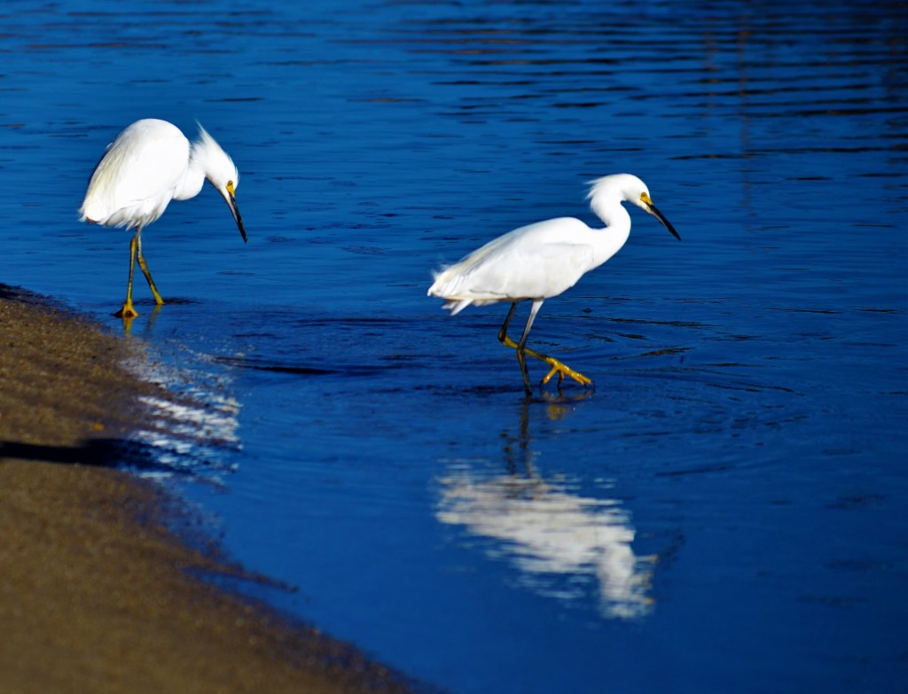 On most mornings I walk to the local lagoon to see wildlife and the fog. Yesterday, with Ivan on leash, egrets sailed overhead while I stood on lagoon’s edge. Clicked the camera while the Moody Blues’ “Nights in White Satin” blared away from a camper van in the parking lot, about thirty feet away. The camper was in his moment, emerging from the van to stretch before returning to his “home” to turn down the sound. Meanwhile, snowy egrets were feasting on small fish. Great song. Great lagoon. Peace.