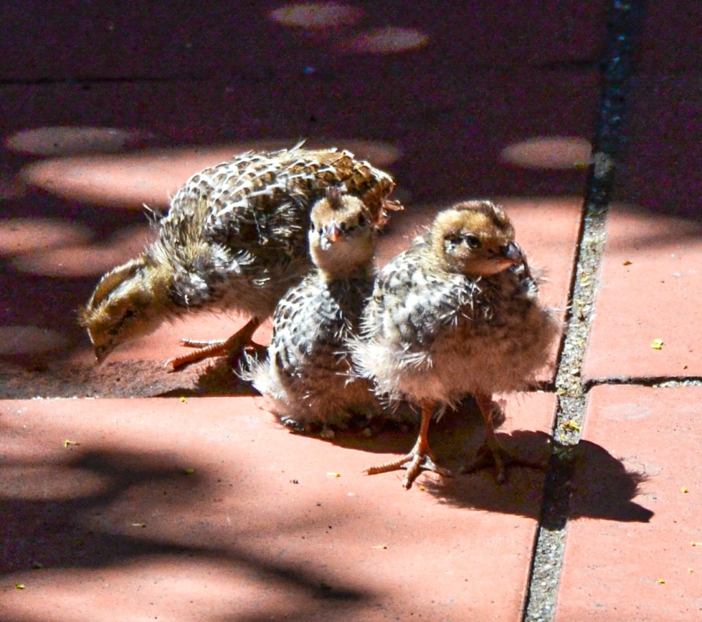 Took this shot of quail chicks, probably three weeks old, through a window looking out on a patio. Dogs in house. In the beginning there might be a dozen chicks, but the numbers are reduced quickly by predators (hawks, cats, etc.). Both parents, out of camera shot, are watching their young negotiate life.