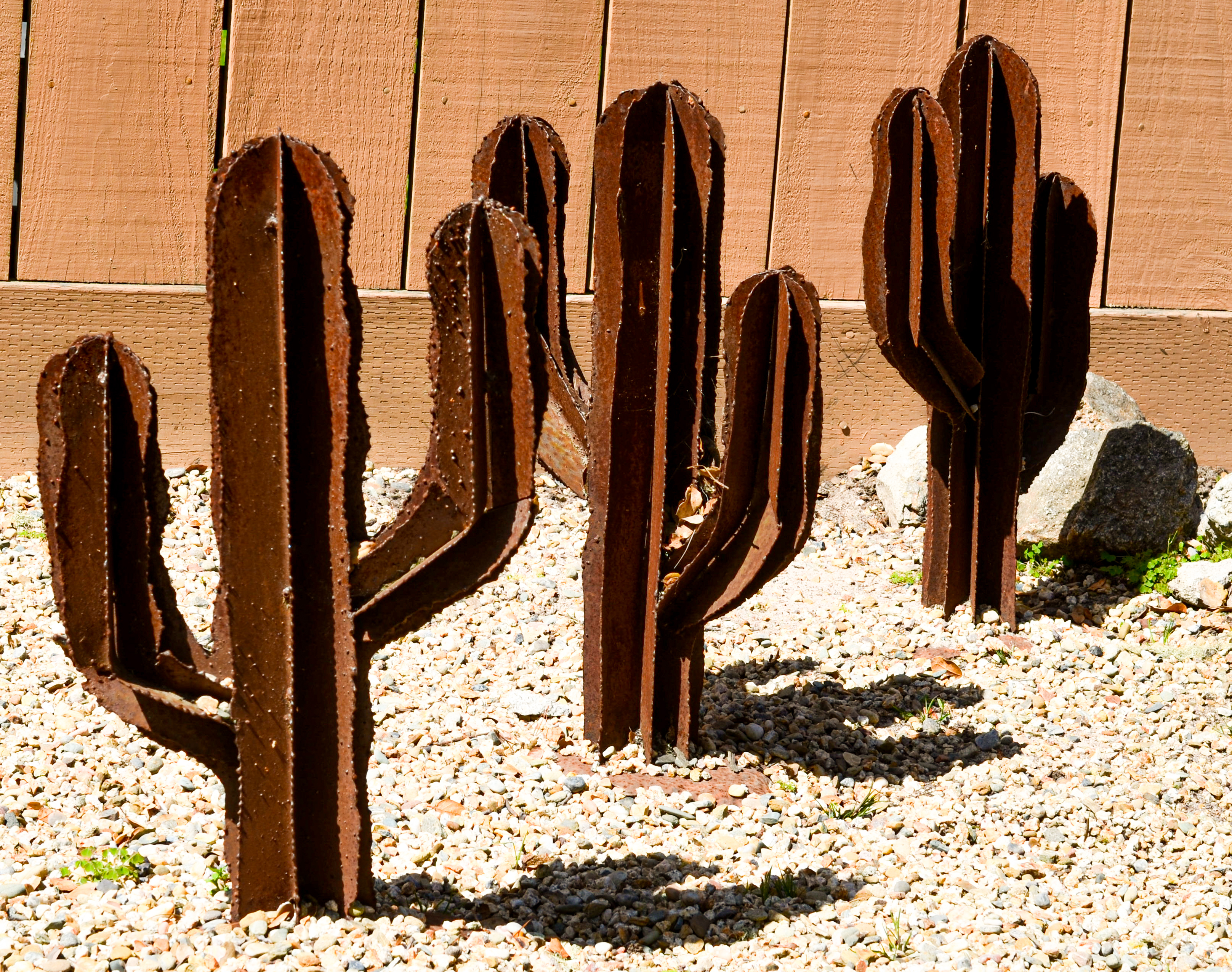With water a precious, expensive commodity on the north coast, these three iron cacti stand watch over zero water maintenance landscape. No further explanation required.