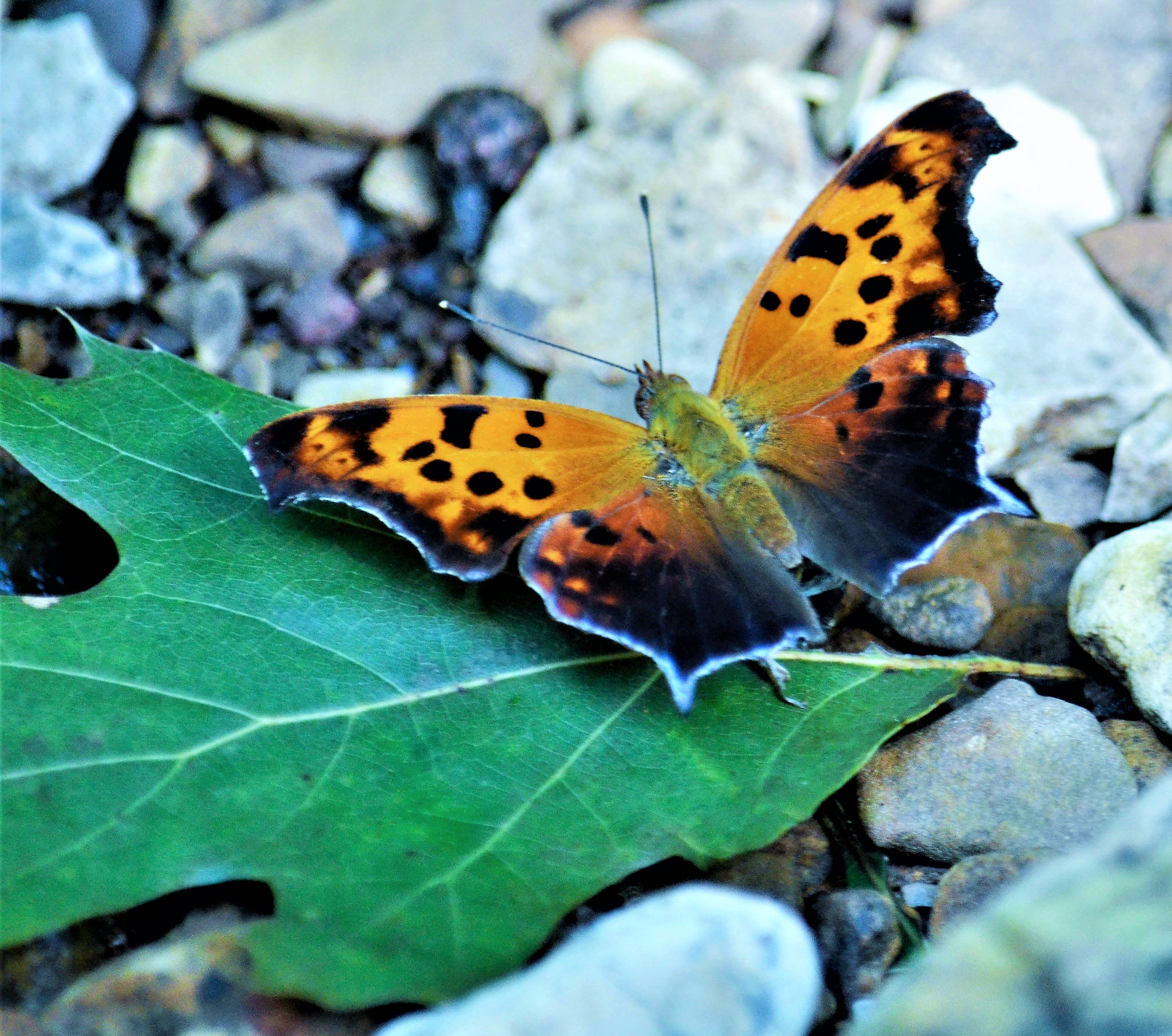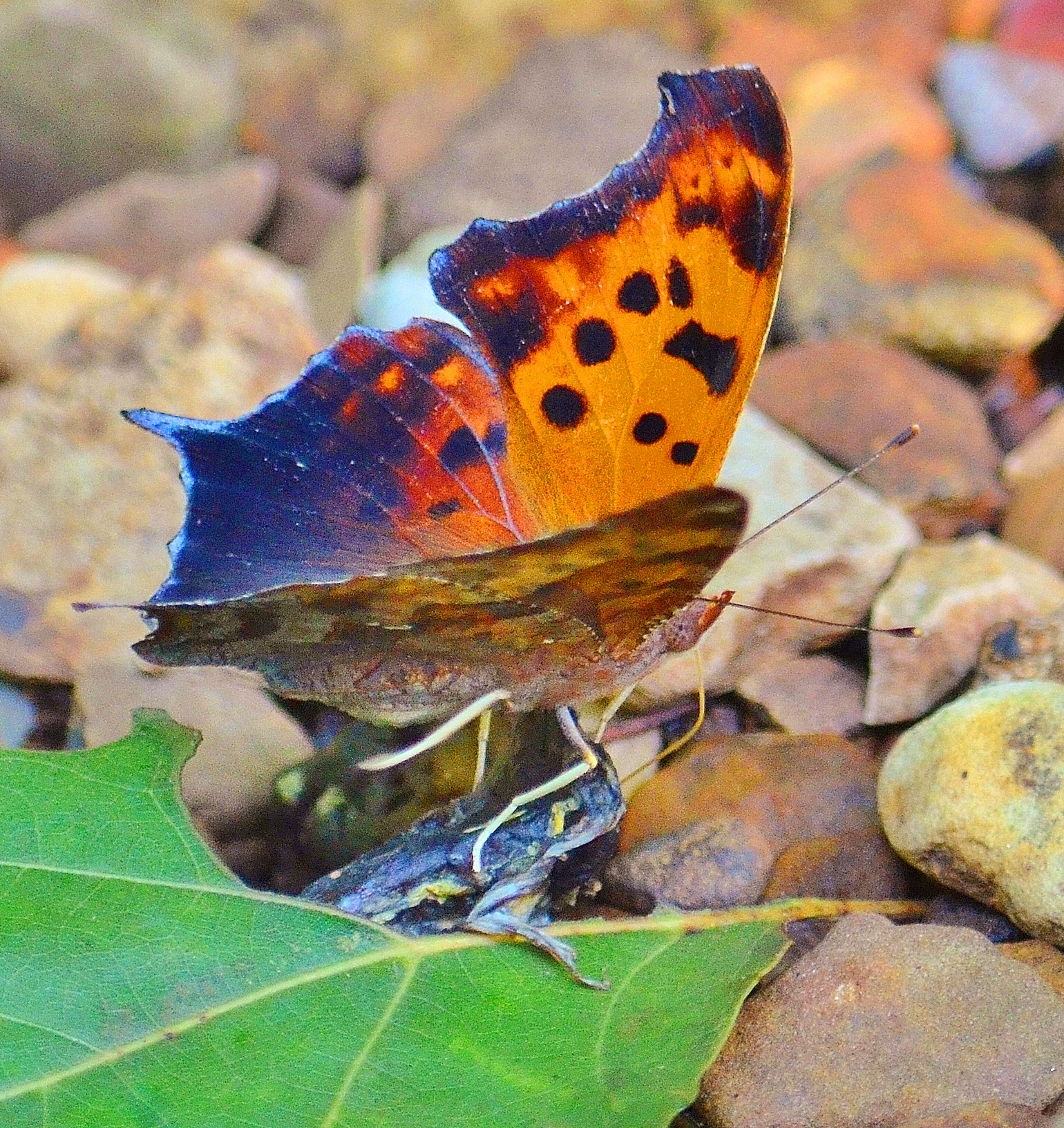 Took this photo of an eastern comma butterfly a few years ago in Southern Illinois. This week in reviewing the photos taken that day, I noticed the butterfly was on top of “something” that looked like a dead creature of sorts. Strange,