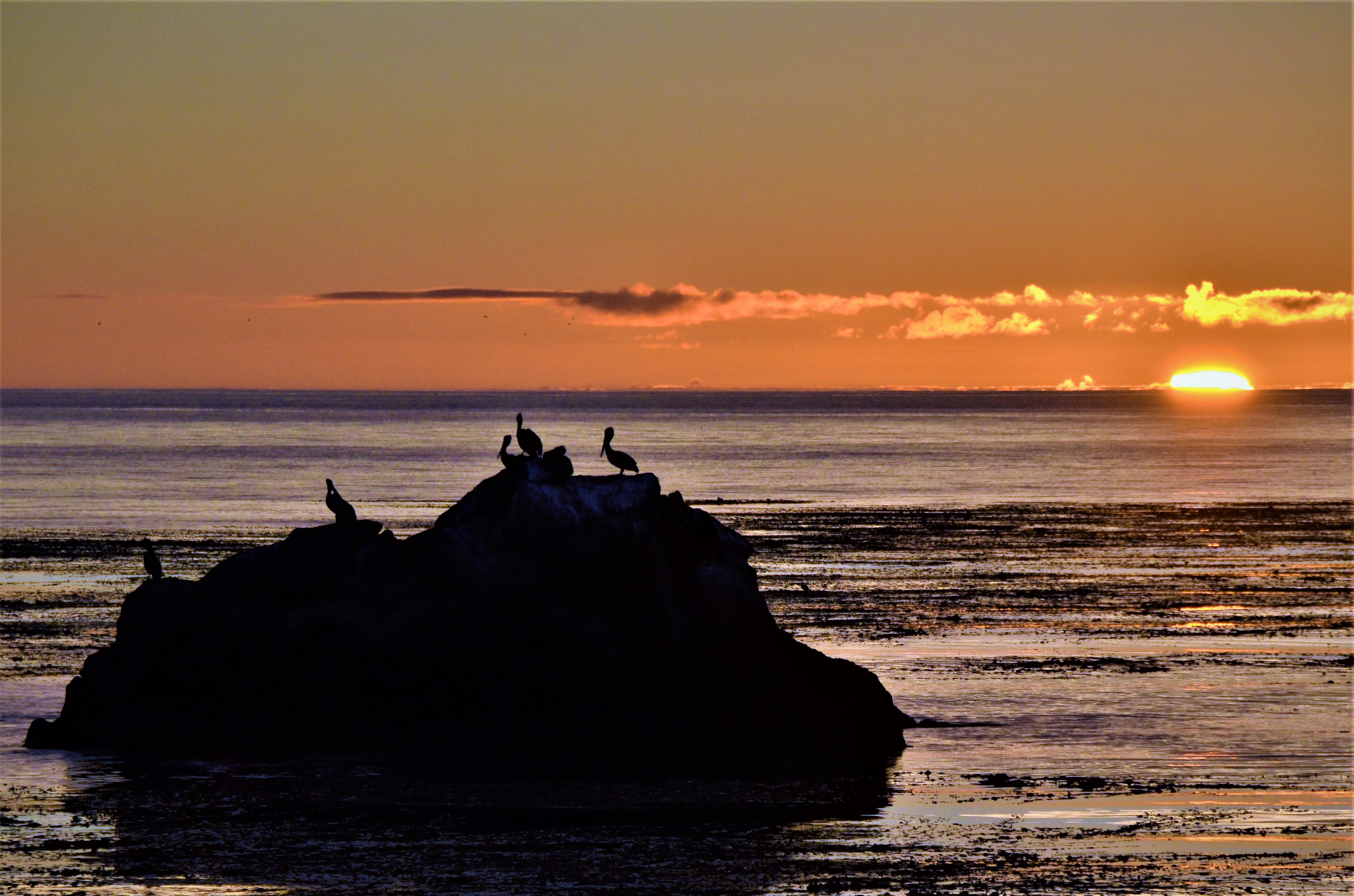 Pelicans on an ocean outcrop watch the sun set off the coast of Carmel.