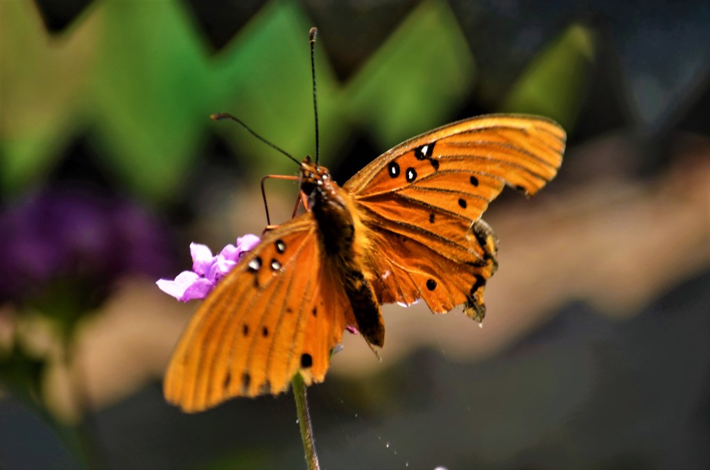 This gulf fritillary butterfly has lost part of its right wing, but it flutters about as smoothly as always.