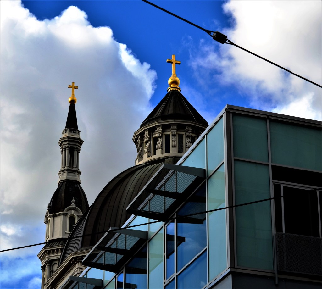 Electrical wires for Sacramento’s light rail system, a very ugly office building and a cathedral with gold crosses clash on a great day to take photographs.
