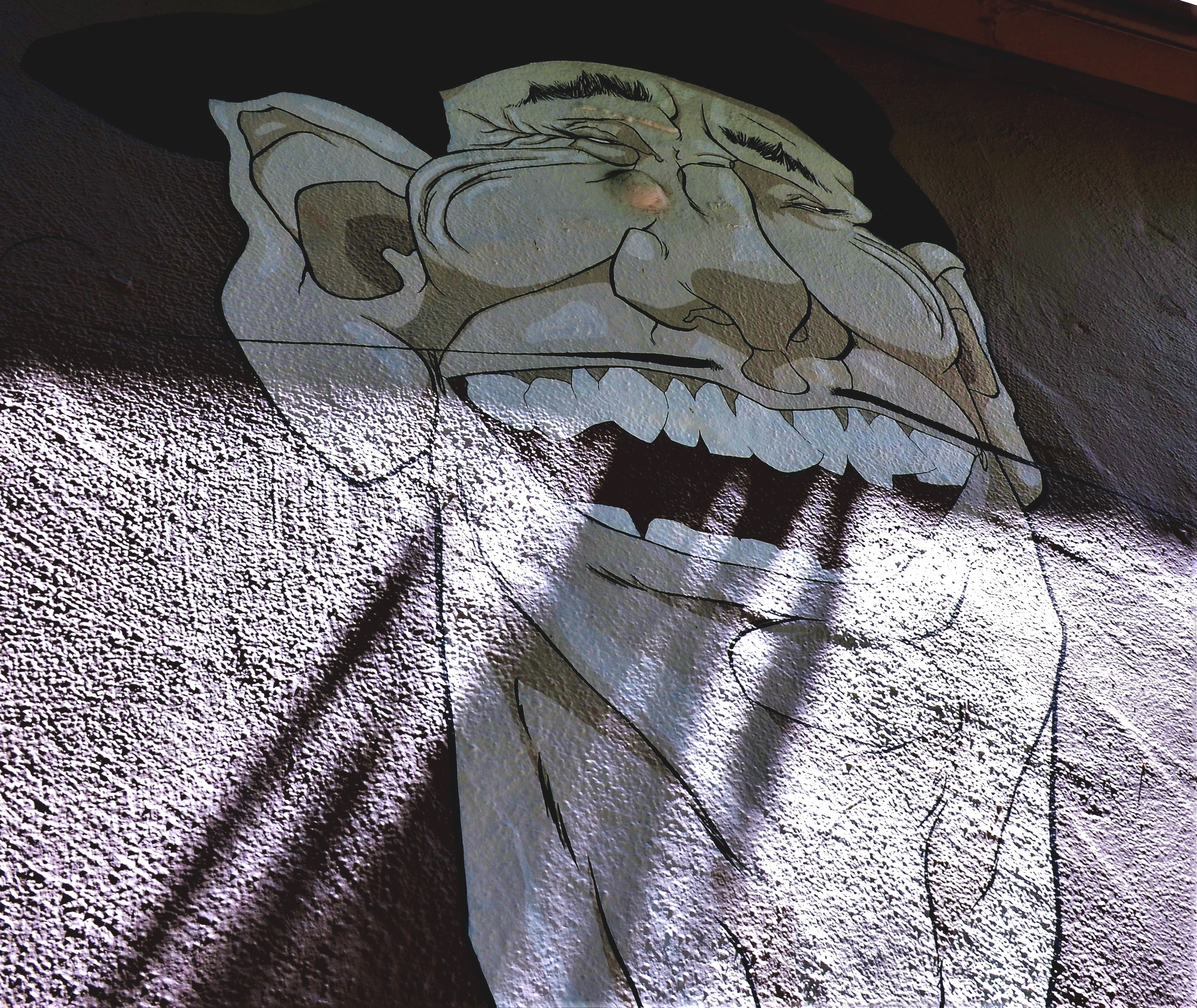 Sunlight extends the drama of teeth on this wall mural in Sacramento.