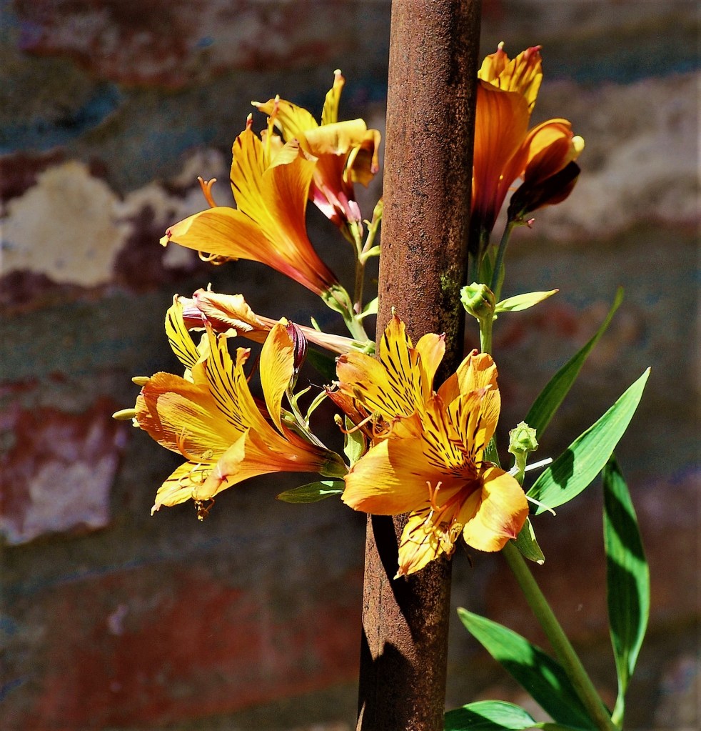 Here’s a Peruvian lily hugging a rusty pole in the bright sun, my idea of contrasts.