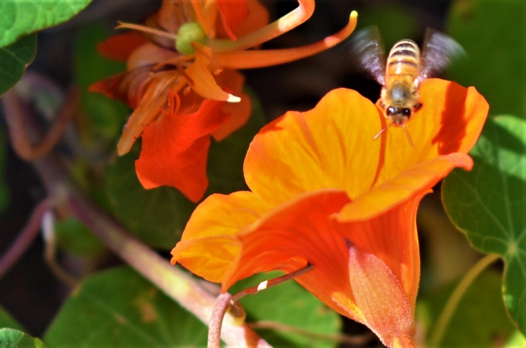 A honeybee descends into a nasturtium bloom.