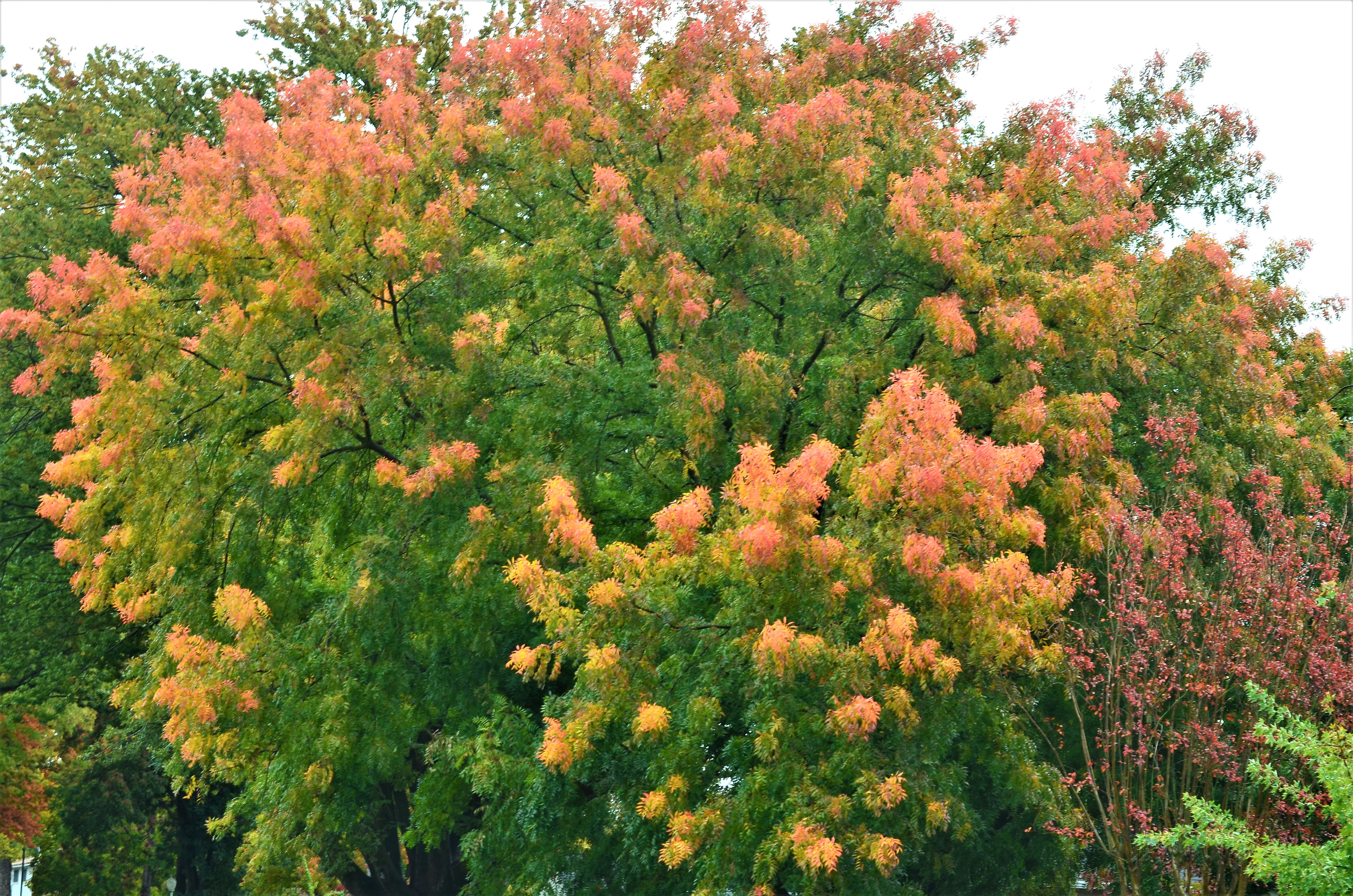 Autumn colors are led by red this year with a neighbor’s tree, as shown, being the first with its brilliance. A few houses down a silk tree began to show its fiery tips. A major storm is coming in tonight, so no telling what brilliance will be on display tomorrow.